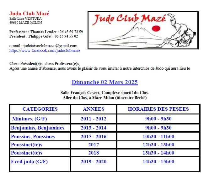 C'est avec plaisir que nous vous faisons part que notre Interclubs sera de retour et aura lieu le 02 mars 2025 au complexe sportif du Clos à Mazé.