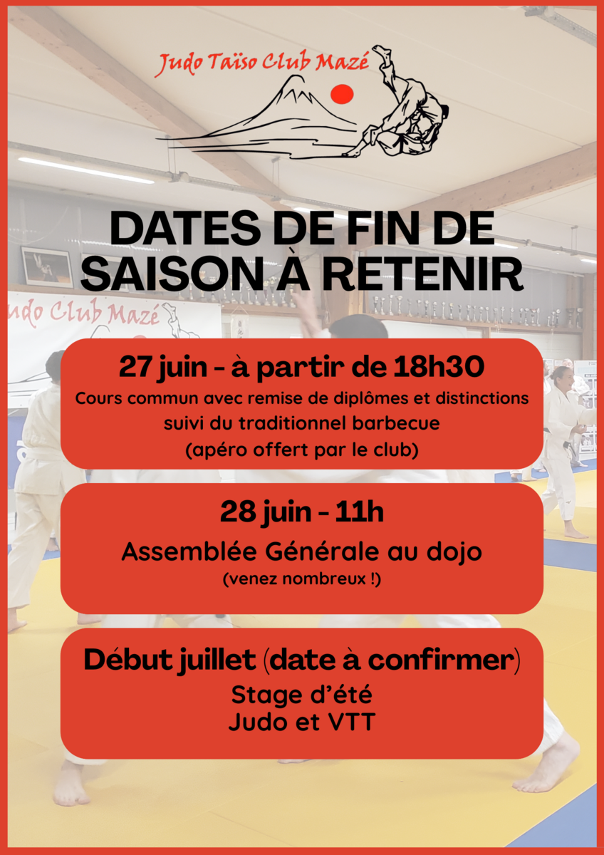 Le lendemain, samedi 28 juin à 11 h 00 (après les derniers cours éveil et de taïso), vous êtes les bienvenus à notre Assemblée Générale. Les bilans moral, sportif et financier seront évoqués ainsi que l’élection du bureau pour la période 2025-26. Nous vous attendons nombreux.